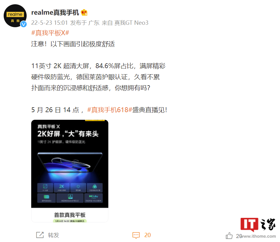 IT之家 5 月 23 日音讯,realme 首款平板 —— 线 日正式对外发布。今天下午,realme 官方发布了真我平板 X 的屏幕参数。
