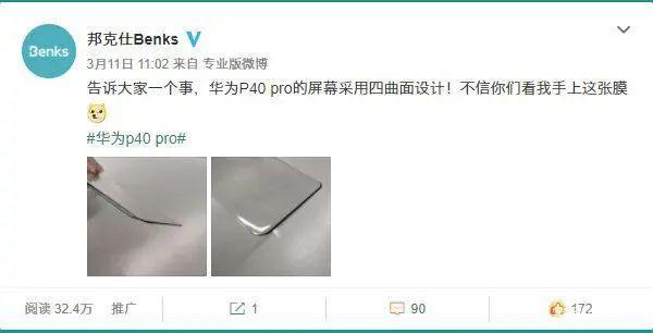 邦克仕Benks提早并精确预测到华为P40 Pro四曲面屏幕的贴膜厂商,应该也预备推出了华为P40系列新机的对应贴膜。