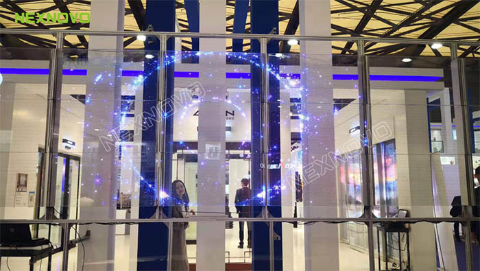 NE系列光电玻璃屏--使用钢化玻璃为基材,采用驱动芯片和LED发光芯片植入技术及纳米膜玻璃表面电路工艺,成功发明了一种高透明度的LED光电玻璃屏,可紧贴玻璃幕墙安装,也可以当作结构玻璃使用。可大范围的应用于玻璃幕墙楼宇亮化,商业综合体,商超,观光电梯,地铁公交站台等。