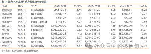 国内PCB主要厂商产销量较为稳定,等待库存量出清后的需求拐点。2022年国内PCB主要厂商产销量较为匹配。销量方面,大部分国内主要厂商销量保持稳定,兴森科技2022年销量增速达到7.27%。产量方面,东山精密增长较快,增长率达到4.99%。从产品面积和产品产值来看,景旺电子产量达到926.97万平方米,鹏鼎控股产量达到271亿元。受到PCB整体行业景气度和客观因素刺激,厂商此前为预防供应链风险导致库存承压,我们认为库存量的逐渐消化将有利于PCB行业回暖。