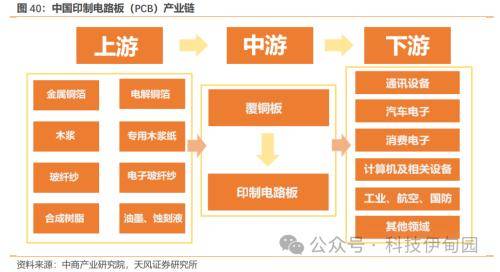 印制电路板(PCB)制造行业上游主要为铜箔、木浆、玻纤纱、树脂等原材料厂商;中游主要为PCB制造商,其中覆铜板是PCB制造的核心原材料;下游主要为通信,电子,半导体,计算机等领域的公司。