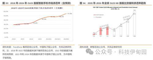2023至2024年,OLED面板智能手机渗透率保持上升,集邦咨询预计24年同比增长7 pct。随着OLED面板在手机应用上逐渐增加,OLED面板在智能手机的渗透率不断增加,由2018年的不足30%至2023年达到了48%。而到了2024年,TrendForce集邦咨询预计这一指标将达到55%。12月22日,据OLEDindustry公众号,2024年三星低阶手机将有3000万支弃LCD改采用OLED,为三星首次在低阶手机使用OLED机种的尝试。