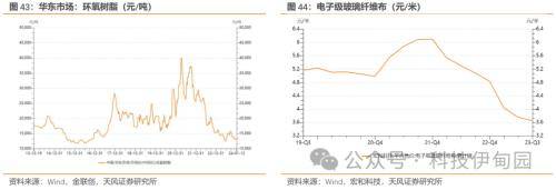 环氧树脂和电子级玻纤布价格同样处于低位。市场价格2022年7月维持20500元/吨价格高位,随后开始了震荡下降。23年全年华东市场环氧树脂高峰价格为16250元/吨,全年平均价格为14437元/吨,截至24年1月12日环氧树脂价格13433元/吨。2021年12月电子级玻纤布市场价格上涨至近三年的峰值6.10元/米,此后电子级玻纤布市场价格持续下行,截至2023Q3电子级玻纤布市场价格3.65元/米。
