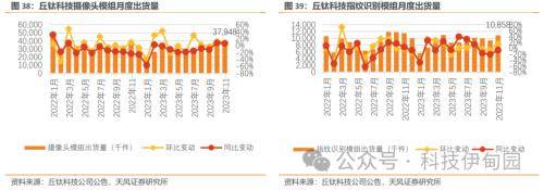智能手机光学模组旺季出货量基本恢复至21年水平,行业有望逐步回暖。2021年OPPO、Vivo等安卓厂商备货激进,舜宇手机摄像头模组单月出货量高增长,2021/02单月出货量创新高,2021 Q2增速放缓,受安卓手机整体需求疲软及高端化不足光学降规降配影响,2021Q3/Q4开始承压,2022需求不振&下游去库存出货量持续下行,2023/02同比增速触底,2023/06同比增速转正,7/8/9连续三个月同比增速超过35%,行业呈回暖态势。2021年12月丘钛单月摄像头模组创历史新高,高端(32M以上)摄像头模组出货量持续高增长,2021/11创单月出货量历史新高,同比增速高达75%,22年受安卓需求疲软、行业去库存、手机光学降规降配影响,出货量呈整体下滑趋势,高端出货量承压更为明显,2023高端需求逐步复苏,2023/02同比增速恢复增长,7/8/9月度出货量基本回归2021年水平。