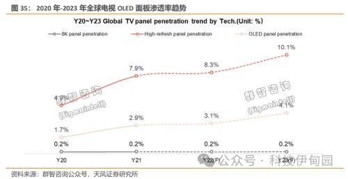 在TV(电视)市场,OLED面板渗透率持续增长,受惠于大型赛事,面板需求将提升。2020年全球电视OLED面板渗透率为1.7%,2021年至2023年持续增长,群智咨询预计全球电视OLED面板渗透率在2023年达到4.1%;高频刷新面板渗透率2020为4.9%,群智咨询预计将稳定增长并在2023年达到10.1%;8K刷新率面板渗透率维持在0.2%,预计到2023年底渗透率不会明显变化。需求方面,据面板厂群创光电表示,面板业明年可望受惠大型运动赛事,带动需求,包括欧洲杯、美洲杯在6月开赛,所需新品出货时间落在3月;另外,7月巴黎奥运也可望带来电视面板需求。因此,至明年下半年,面板行业景气或将明显转佳。