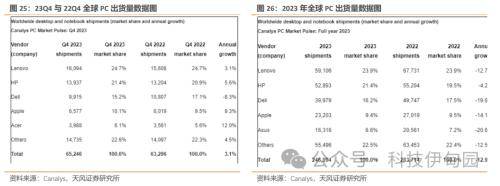 PC方面,2023全年出货量为2.47亿台,同比下降12.9%,其中23Q4出货量同比增长3.1%。其中戴尔同比下降8.3%,其他多数厂商均实现同比增长。研究机构Canalys发布数据显示,2023全年出货量同比下滑12.9%,主要为23Q1季度出货量大幅下滑33%所致。其中23Q4 PC市场出货量为6525万,同比增长3.1%,环比下降0.46%。分厂商来看,根据Canalys数据,联想依旧保持领先地位,Q4季度出货1609万台,同比/环比增长3.1%/0.39%, 惠普排行第二,出货1394万台环比增长3.15%,戴尔第三,出货992万台;苹果第四,出货658万台;Acer第五,出货399万台。
