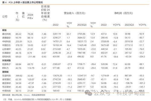 PCB上中游A股标的景气度低位。铜价震荡下行,环氧树脂和电子级玻璃纤维布价格处于历史底部水平。受到价格持续下跌影响,铜箔、玻璃纤维布和环氧树脂主要标的2022年全年及2023年前三季度营收和净利润业绩复苏低于预期。覆铜板整体仍处于筑底期,A股主要上市公司收入和盈利仍延续下滑趋势。PCB各板块股价较2023年初普遍下跌,CCL板块需等待下游需求回暖以及新的需求增长点出现带动板块实现有序复苏。
