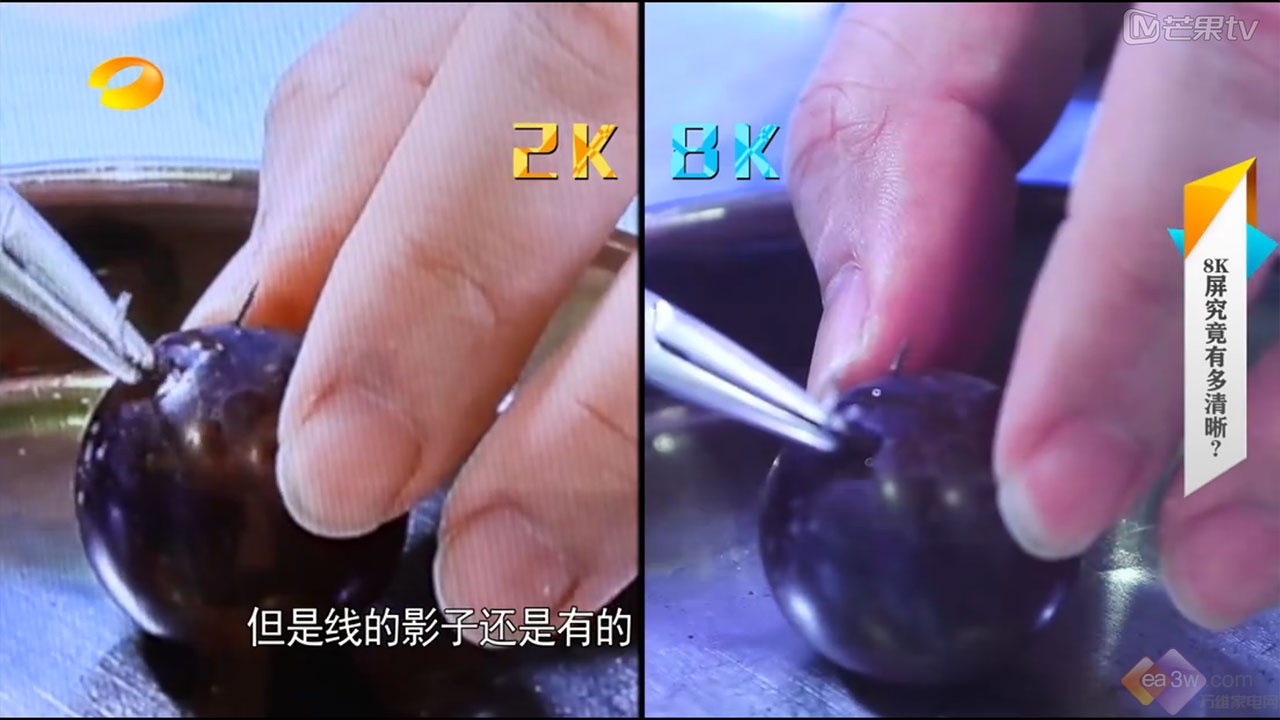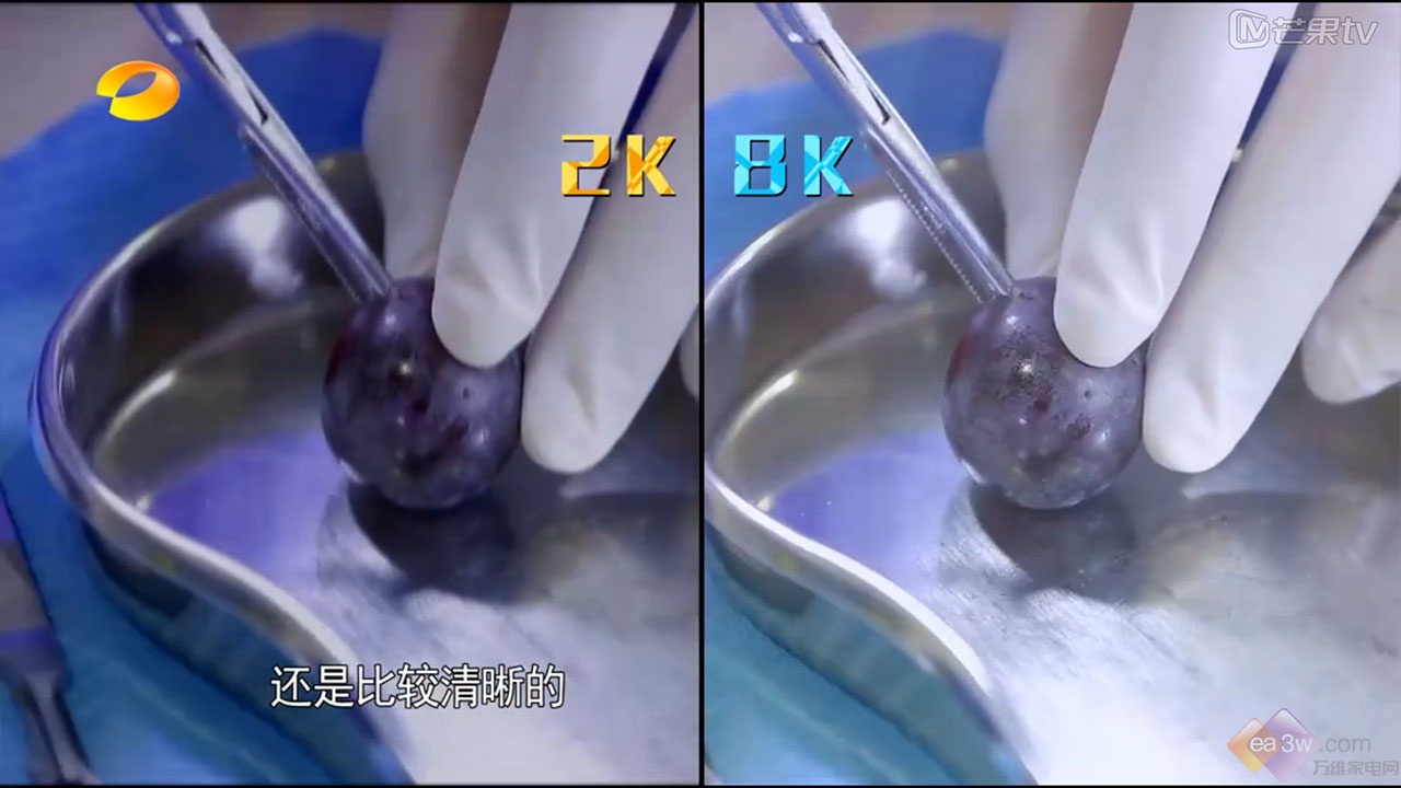 用葡萄模仿“做手术”的进程,先用手术刀切开,取出葡萄籽,然后用只要头发丝1/10细的手术线K屏显示出来的仅仅大约的进程,而8K屏可以正常的看到更多的细节,比如说手术线、葡萄表皮的切断、手术剪子的具体形状等等。
