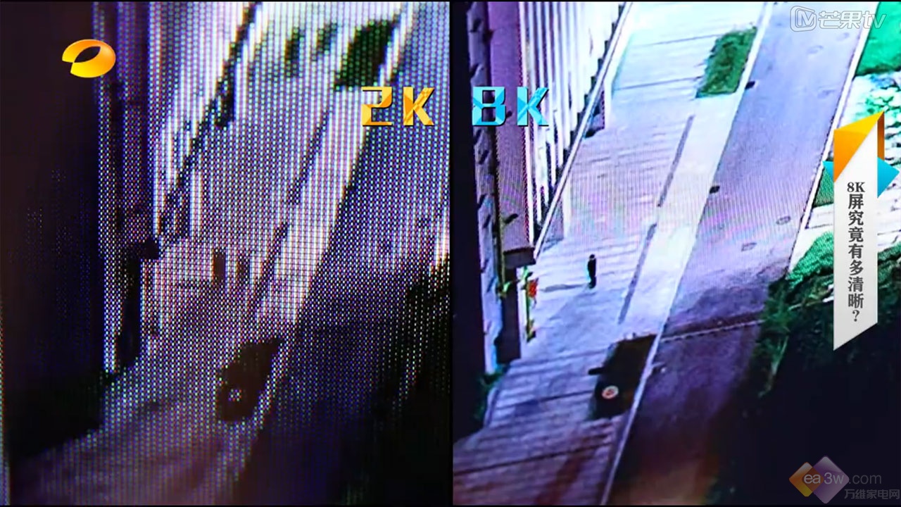 关于街道上的行人,2K屏看到的仅仅几个长方形的图形,其他事物像是打了马赛克。而8K屏傍边的人身体的各个部位都明晰可辨,街道上的绿草地,过道,包含地下的地砖都可以数出多少块来。