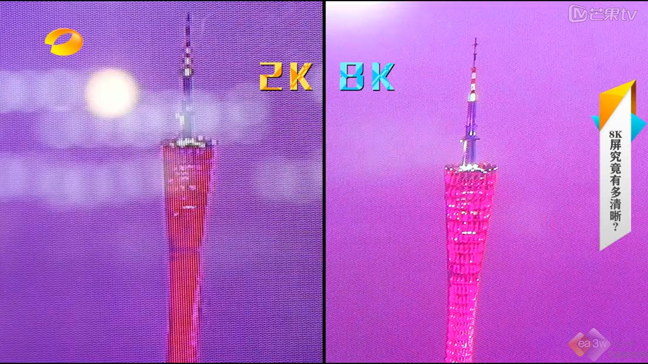 2K与8K究竟差异有多大,咱们先来看看广州标志性建筑“小蛮腰”,2K屏傍边只可以显示出一个大约的概括,而经过8K观看可以看清每一层之间的差异。