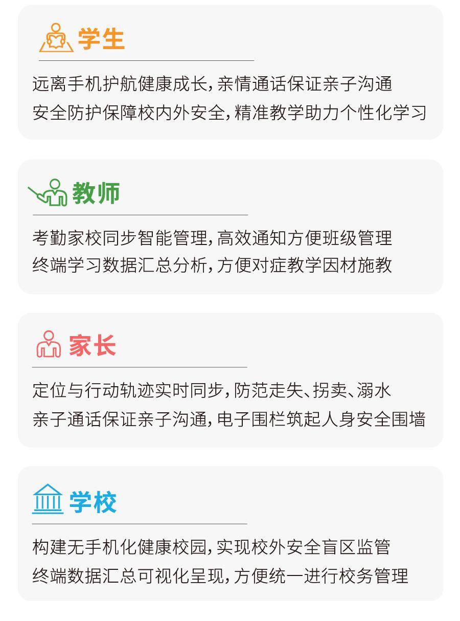 智学卡功用聚集于精准教育,从学习、日子、学校办理、安全防护四大中心场景切入,提炼客户的实在需求转化为实践功用运用,筑牢家校一卡联通的安全防地,护航学生高兴学习、健康成长。