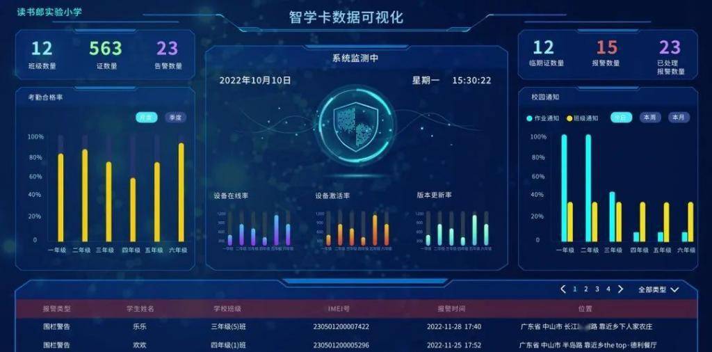 学校办理场景下,其功用首要触及智能考勤、高效告诉、智能安全警报。此外,智学卡学生终端数据经过信息化手法搜集汇总,由大数据看板可视化出现,便利学校进行统一办理。