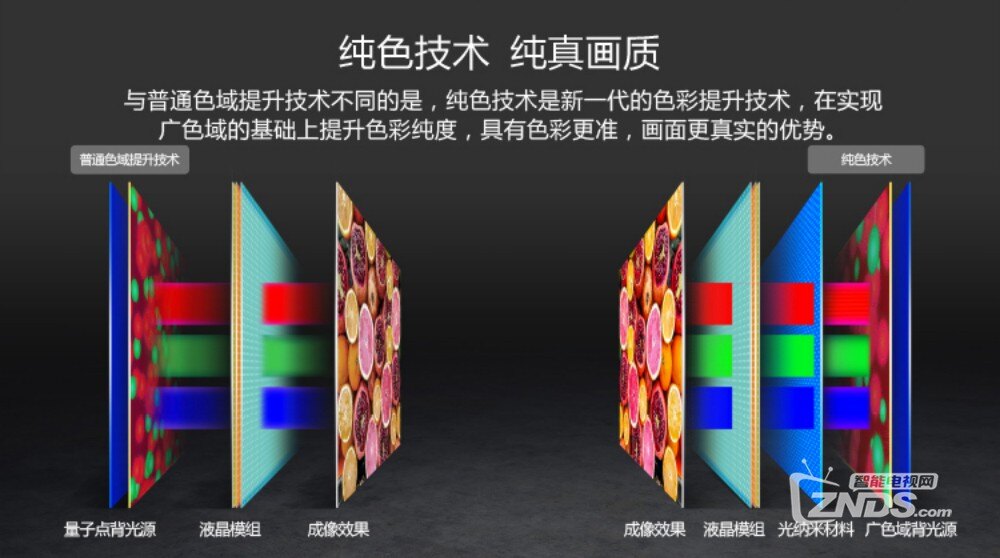 纯色技术是什么?纯色技术就是在广色域的基础上,利用光纳米材料吸收杂光,得到纯净的红绿蓝三原色光。原色更纯,彩色更真。其中光纳米材料是一种直径在1nm左右的微型粒子,可吸收背光源杂光,大幅度的提高色光纯度。