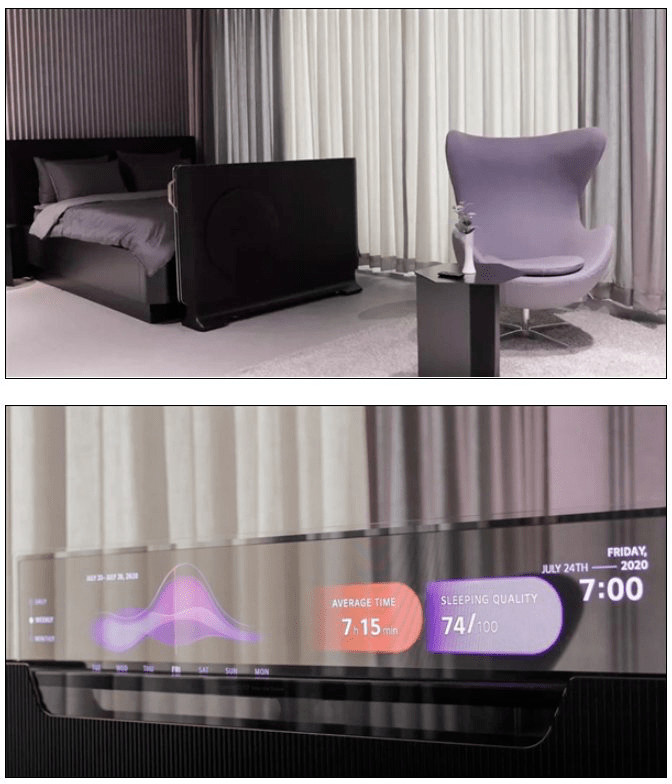 依照官方的演示,这台通明电视可放置在床尾,收纳状况下有长条形的小窗显现日期、时刻等,重点是来了,半升起状况下会显现用户的睡觉时长、心率数据等,当彻底升起来之后便是一款完好的大屏电视了。